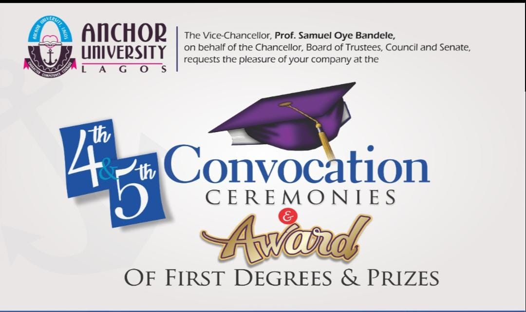 The Vice-Chancellor, Prof. Samuel Oye Bandele, on behalf of the Chancellor, Board of Trustees, Council, and Senate, cordially invites you to the 4th and 5th Convocation Ceremonies and Awards of First Degrees and Prizes at Anchor University, Lagos. Join us in celebrating academic excellence, achievements, and milestones.